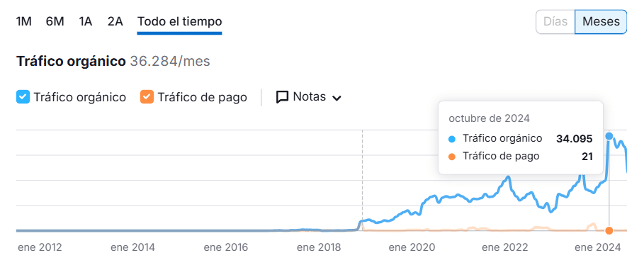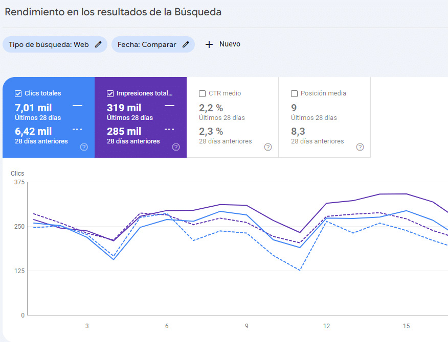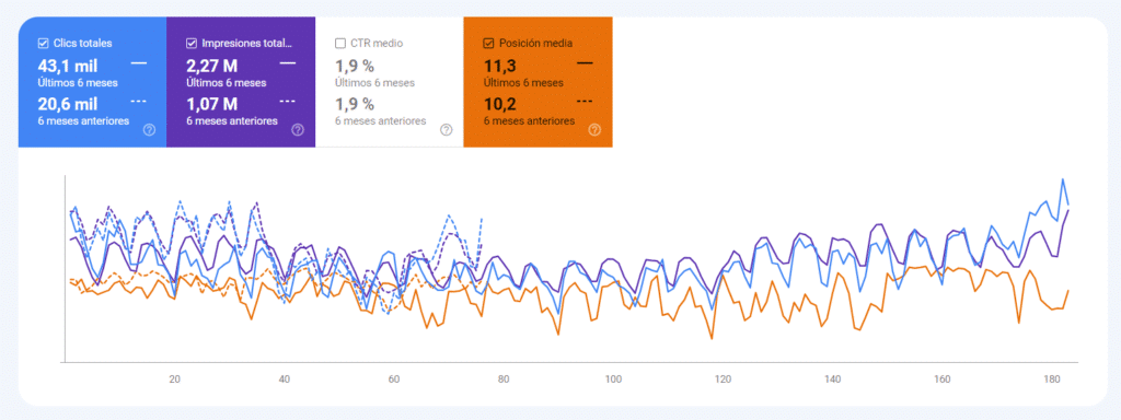 Después de solo tener solo 4000 clics al mes según Google Search Console y de tráfico no calificado, habíamos pasado a 8000 clics al mes, pero calificados, aumentando las ventas del sitio web es un 100%.